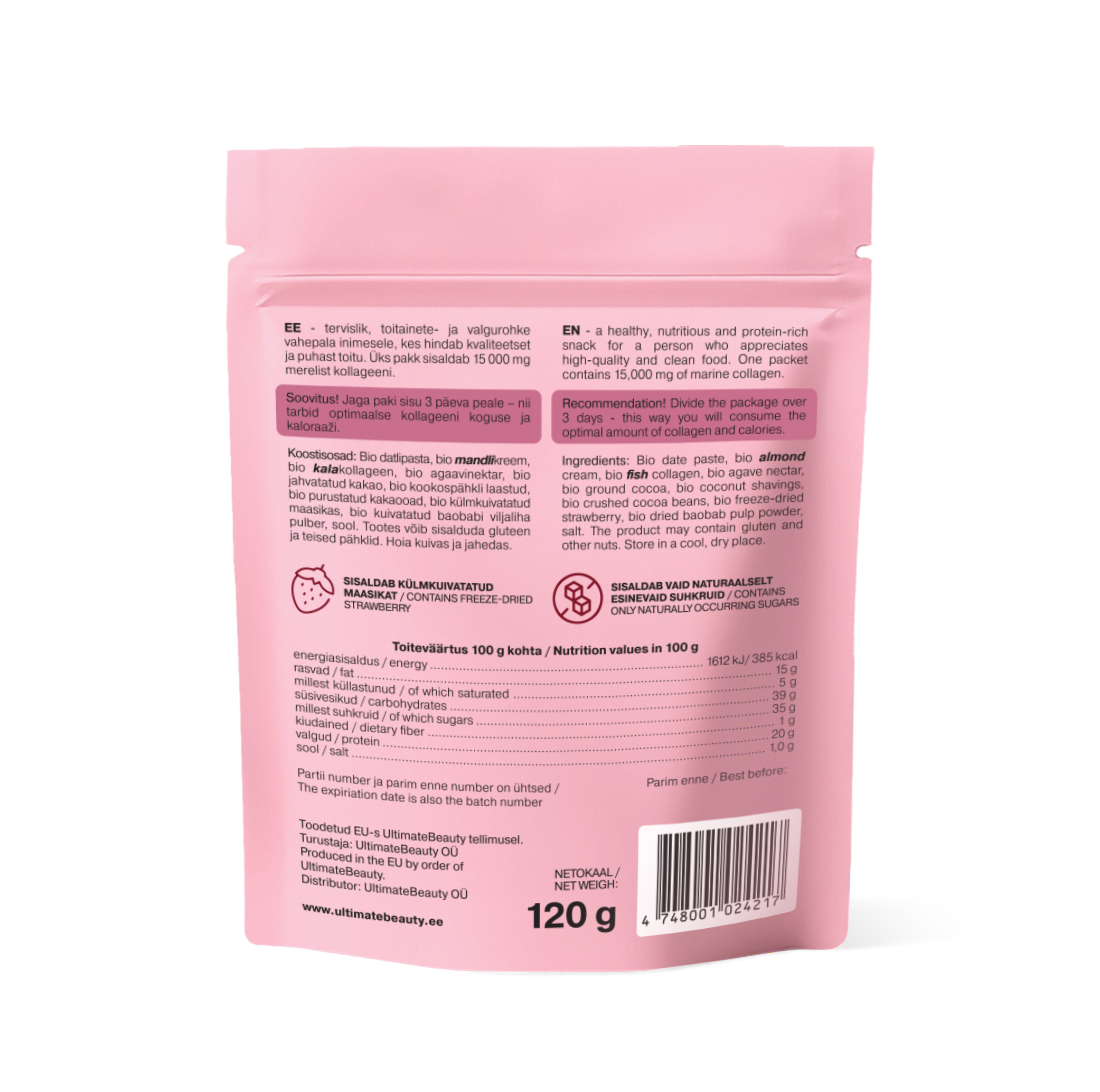 Kodumaiste Beauty Bites’dega hoolitsed oma keha eest looduslike ja tervislike koostisosadega! Beauty Bites on loodud tegusasse päeva maitsvaks vahepalaks ning sisaldab ökoloogilisi ja väga puhtaid koostisosasid nagu magusaid datleid, kreemjat mandlikreemi, mahedat agaavinektarit, krõbedaid kookoslaaste ja külmkuivatatud maasikaid ning lisaks 15 000 mg merelist kollageeni. See ainulaadne kombinatsioon pakub mitmekülgset maitseelamust ja tervislikke toitaineid, mis aitavad hoida nahka säravana ja keha energilisena. Toode proteiini ja kiudainete rohke, mis annavad täiskõhutunde. Sisaldab ainult naturaalselt esinevaid suhkruid!