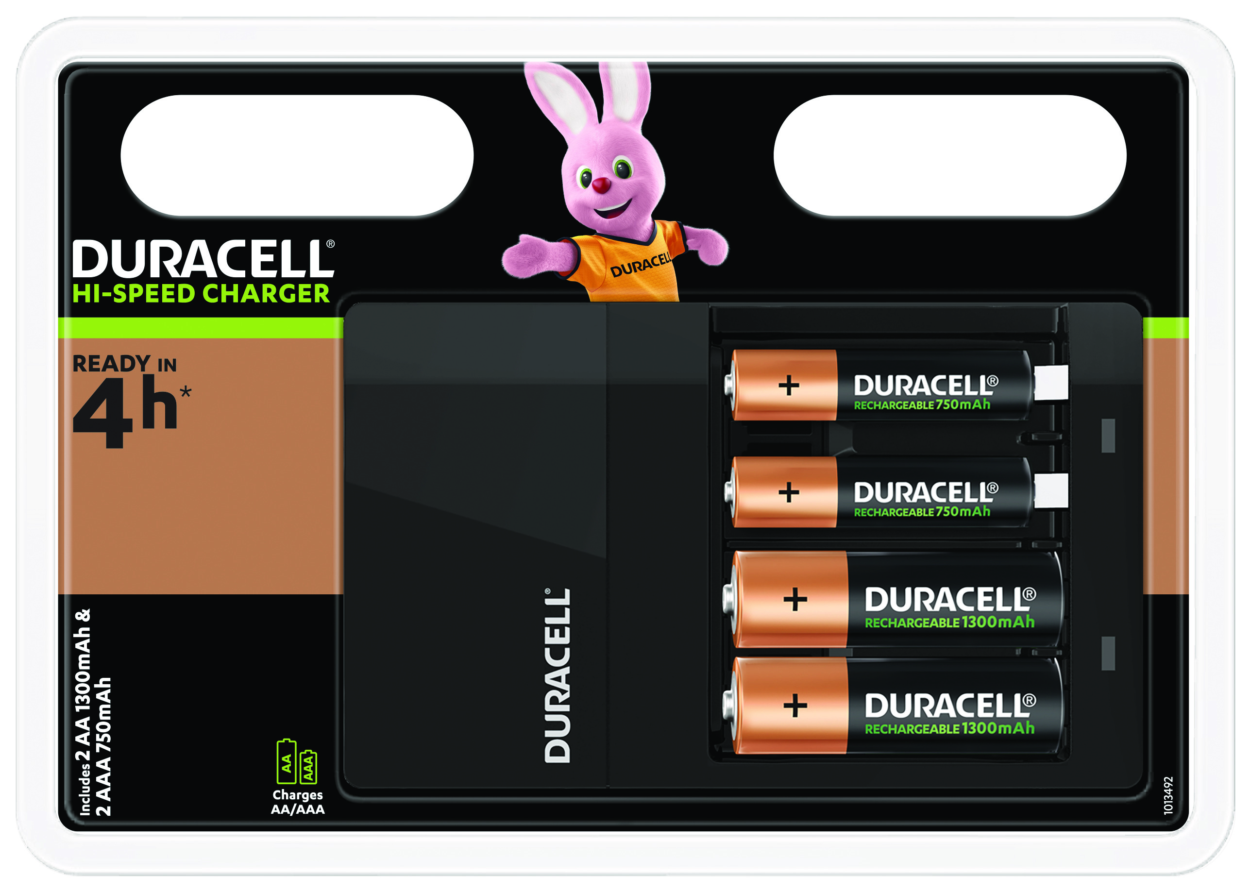 DURACELL kiirlaadija laeb 4 AA akut 4 tunniga (ligikaudu 90% laetud kui kasutad DURACELL 1300mAh AA NiMH akusid, ligikaudu 80% laetud kui kasutad DURACELL 750mAh AAA NiMH akusid).
