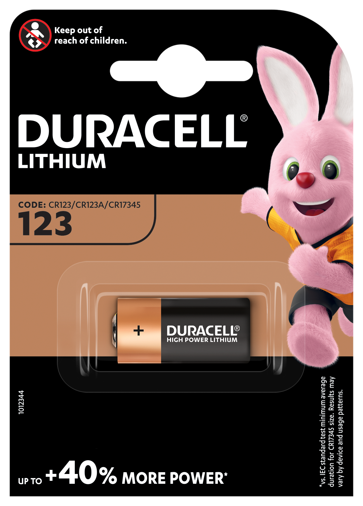 DURACELL High Power Lithium 123 patareid – kuni 40% rohkem energiat (võrreldes CR17345 suuruses patareide IEC-standardtestide minimaalse keskmise kestusega. Tulemused võivad erinevate seadmete ja kasutusviiside puhul olla erinevad).
