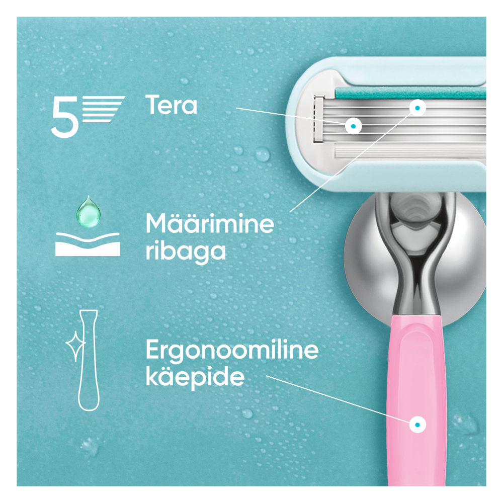 - 5 TERAGA TERAD: Ülimalt nahalähedane raseerimine vaid ühe tõmbega ja siledus kuni 30 päevaks.