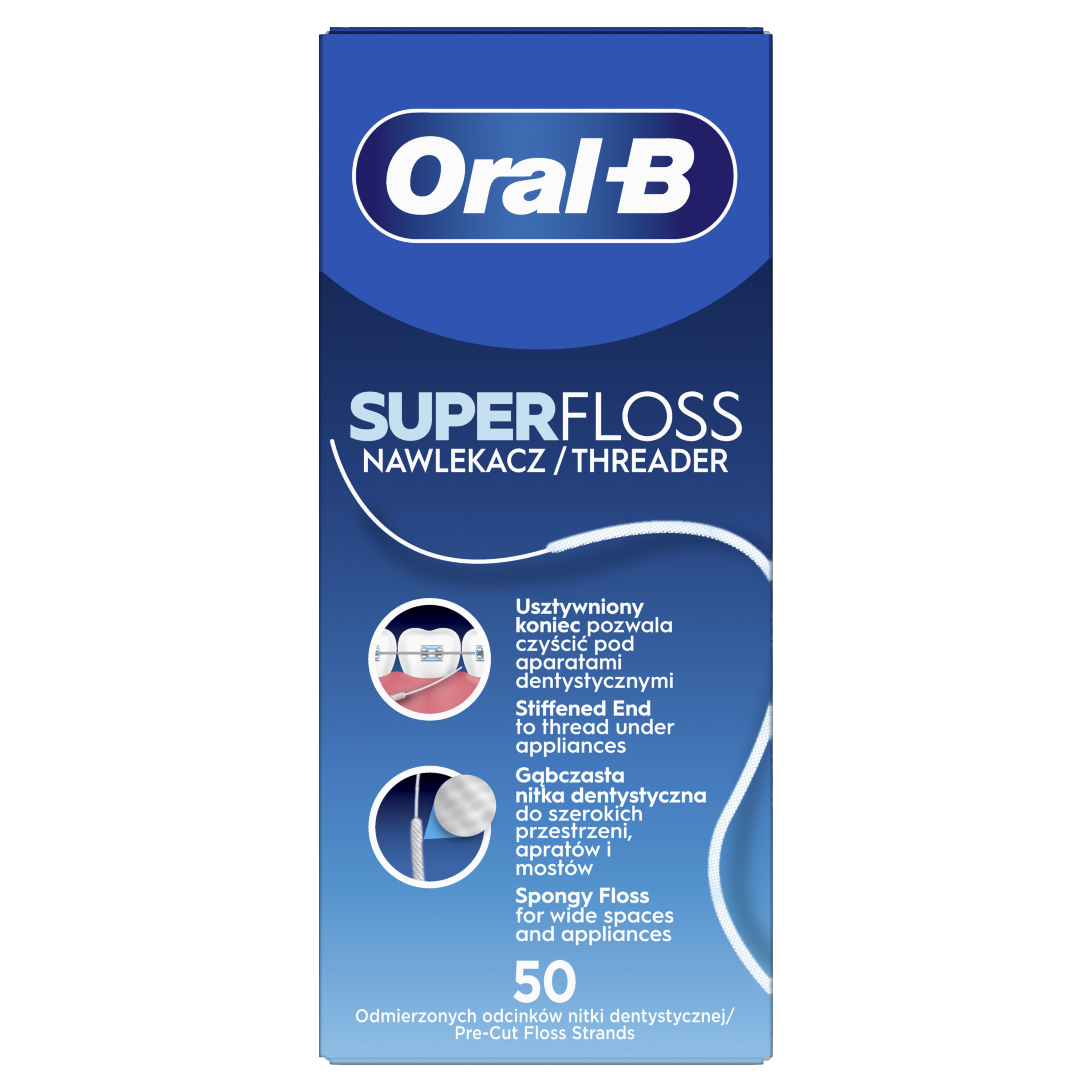 Oral-B Super Floss sobib ideaalselt ortodontiliste plaatide ja breketitele, sildade ja laiade hambavahede puhastamiseks. See koosneb kolmest ainulaadsest komponendist – kõva otsaga niidihoidja, käsnkiud ja tavaline niit – parima tulemuse saavutamiseks töötavad koos.